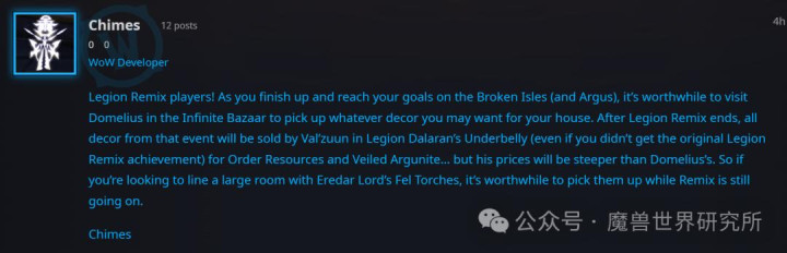 军团再临:幻境新生活动结束后,该活动的所有装饰都将由军团版本达拉然下水道的瓦尔祖恩出售(即便你未解锁幻境新生相关成就),不过需要支付职业大厅资源与虚空碎片,且其售价会远高于多玫里乌斯的标价。